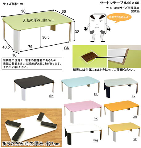 サイズ (W)幅90cm×(D)奥行き60cm×(H)高さ32cm 天板厚:約15mm 折りたたみ時の厚さ:約7cm 材質 繊維板 ラッカー塗装 重量 9kg 梱包サイズ W93×D63×H10cm 11kg 原産国 台湾 注意 ●若干の擦り傷・塗装ムラがある場合がございますが、使用上差し支えの無い程度はご容赦下さい。