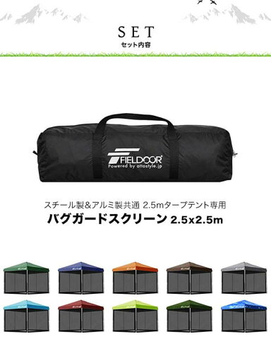 【bugguard】 ブランド: フィールドア(FIELDOOR) サイズ: 2.5m×2.5m タープテント専用(スチール製・アルミ製共通) ※収納時 : (約)72cm×20cm×20cm 材質: ポリエステル 特記事項: こちらの商品にはタープテント本体は付属いたしません。
