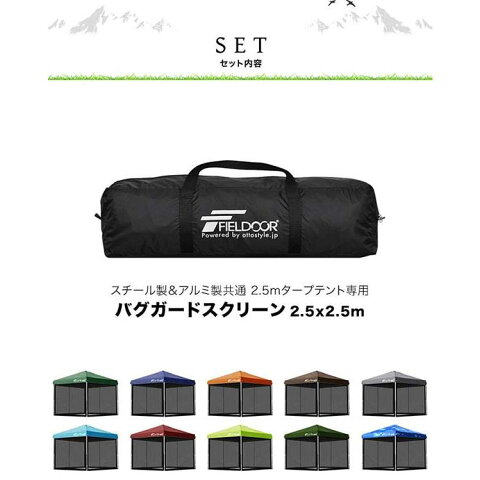 【bugguard】 ブランド: フィールドア(FIELDOOR) サイズ: 2.5m×2.5m タープテント専用(スチール製・アルミ製共通) ※収納時 : (約)72cm×20cm×20cm 材質: ポリエステル 特記事項: こちらの商品にはタープテント本体は付属いたしません。